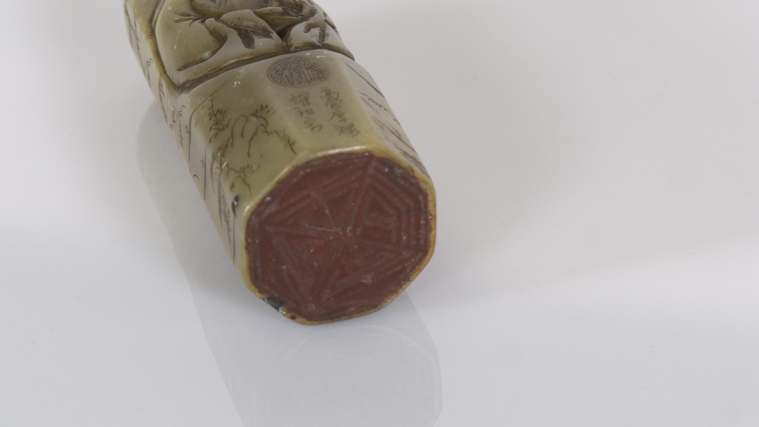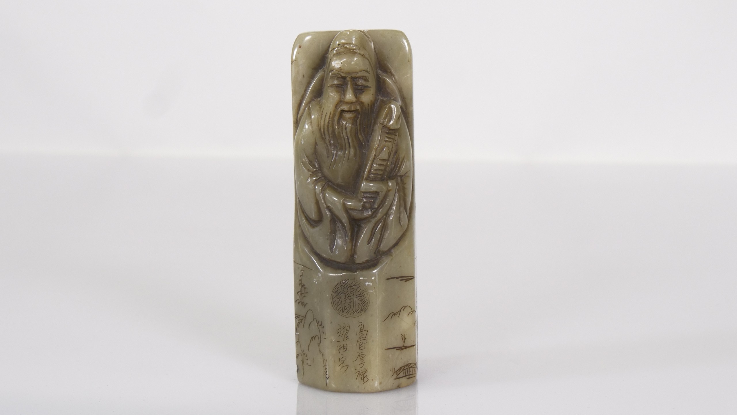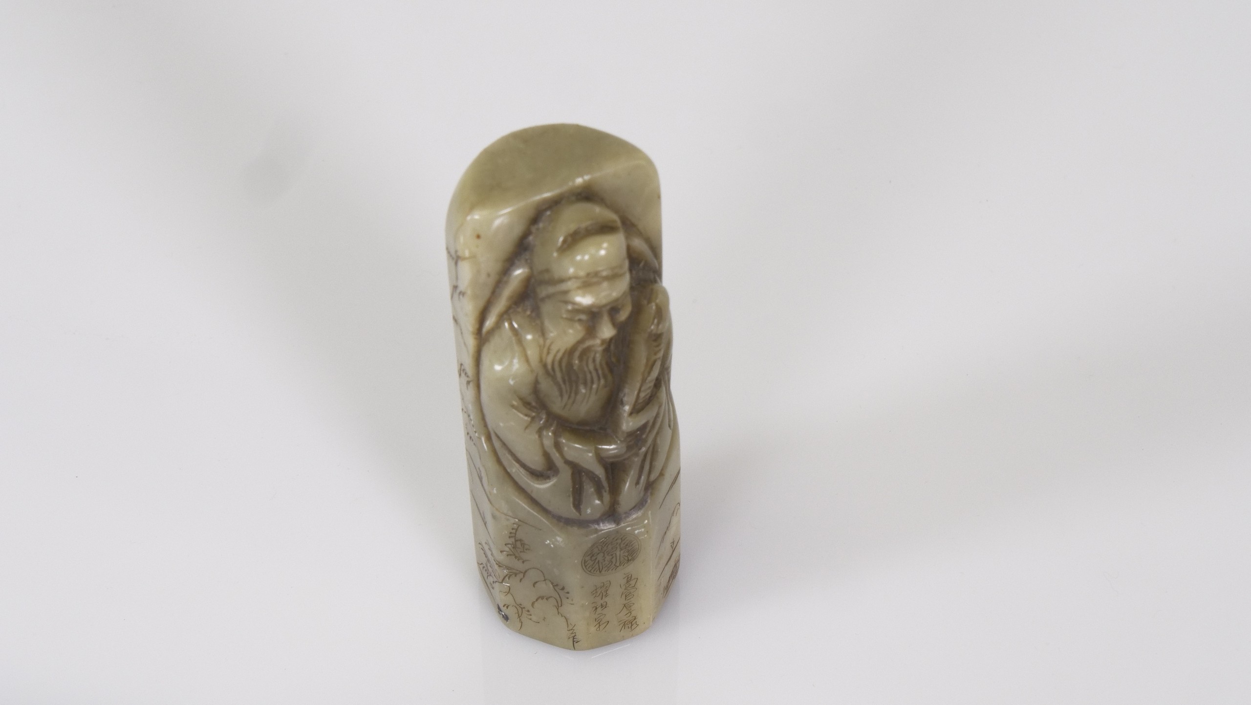 Prachtige handgesneden Chinese stempel uit zeepsteen, met een gedetailleerde afbeelding van een wijze man, waarschijnlijk Shou Lao – het symbool voor wijsheid en lang leven. De zijkanten zijn subtiel gedecoreerd met landschapsmotieven en Chinese karakters. Het stempelvlak aan de onderzijde is intact en bruikbaar. Dit object is zowel functioneel als decoratief en past goed in een interieur met Aziatische invloeden of bij een verzamelaar van Oosterse kunstvoorwerpen.