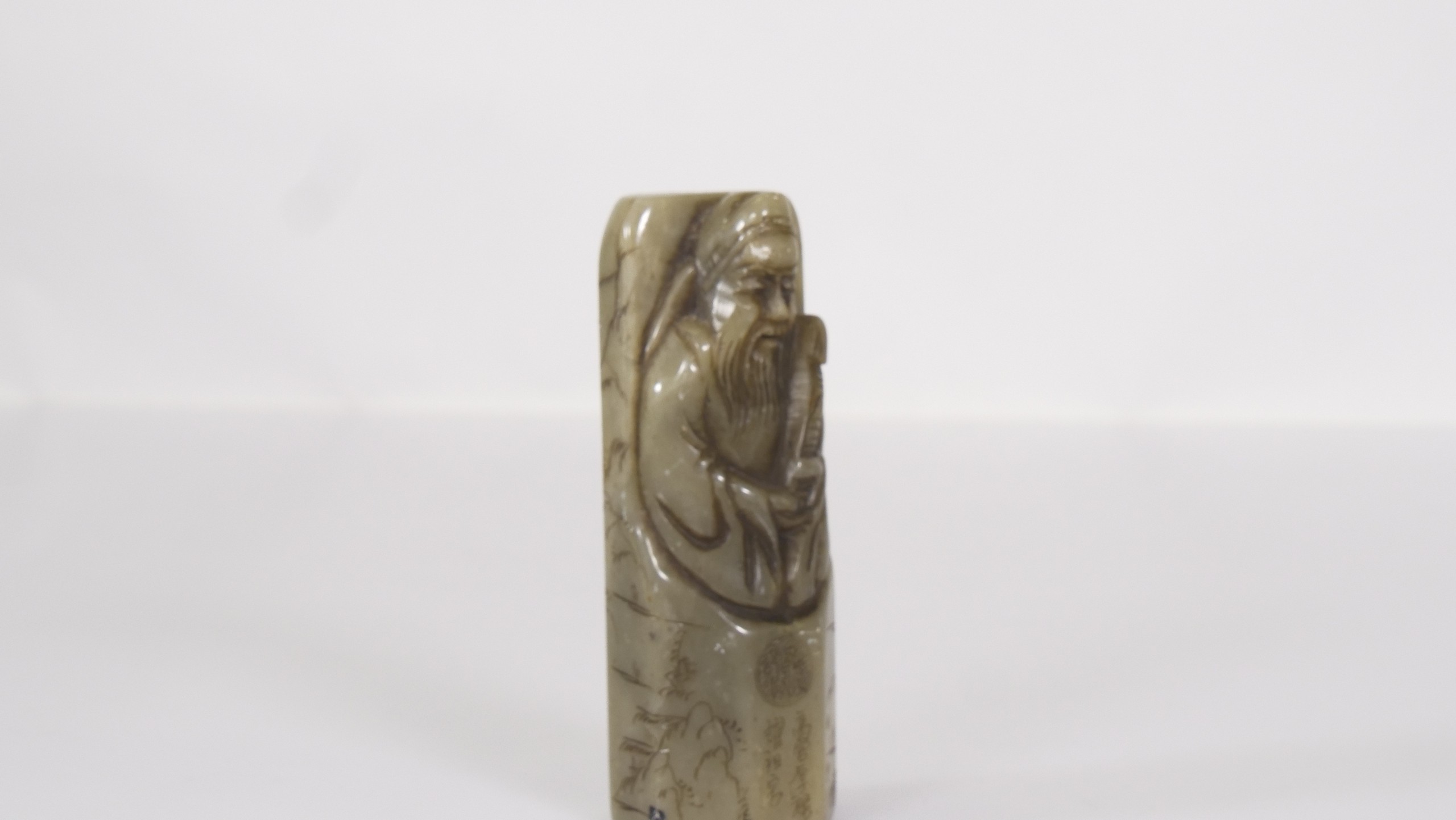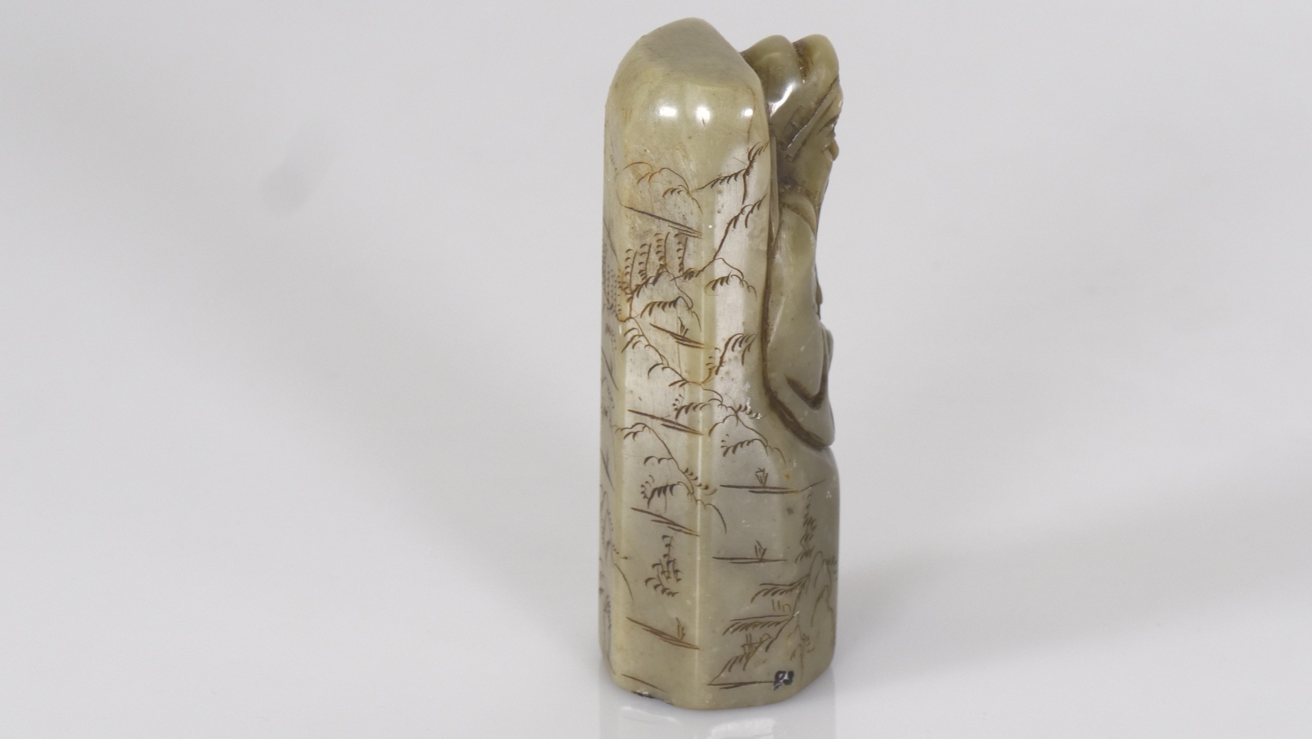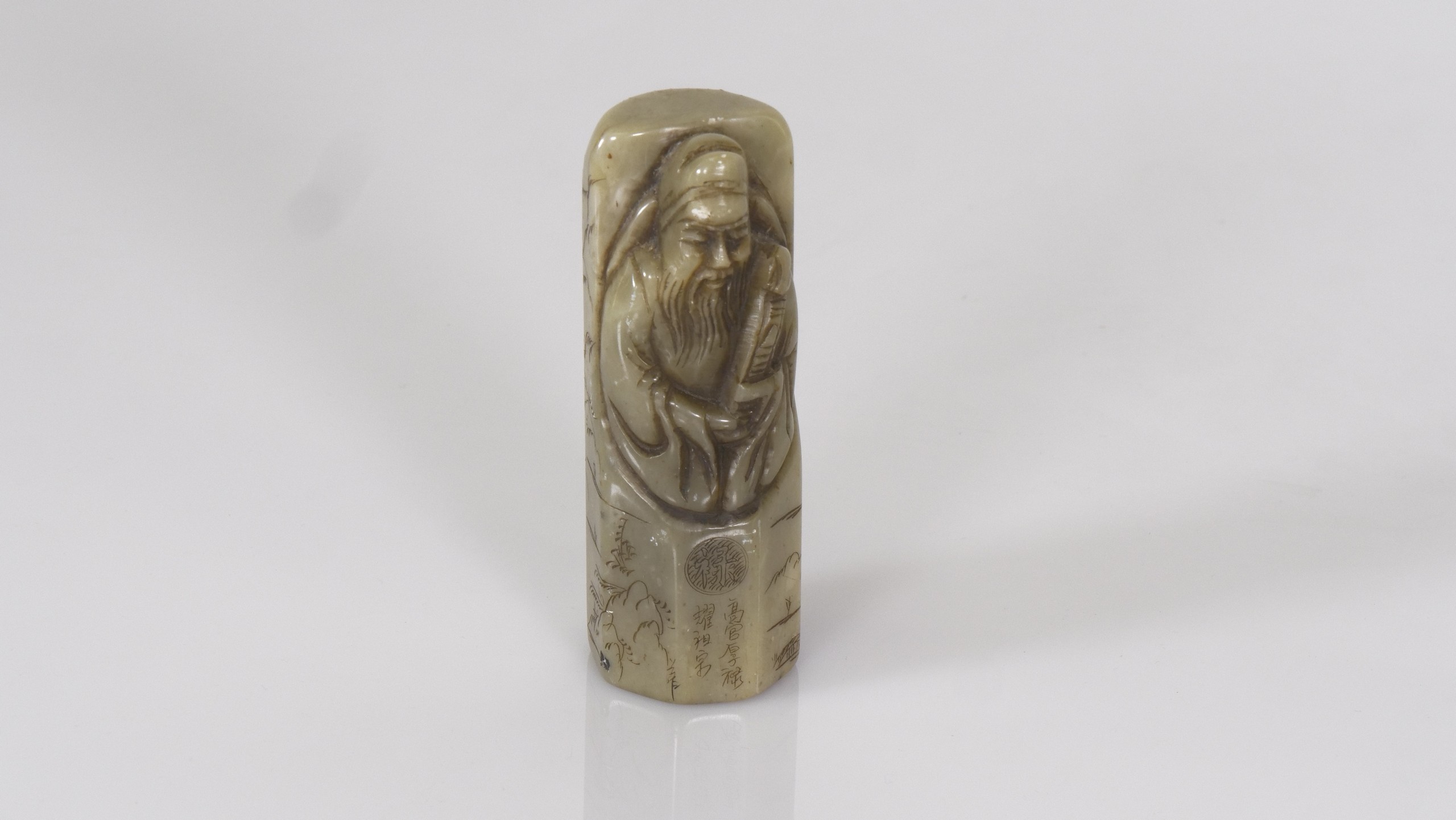 Prachtige handgesneden Chinese stempel uit zeepsteen, met een gedetailleerde afbeelding van een wijze man, waarschijnlijk Shou Lao – het symbool voor wijsheid en lang leven. De zijkanten zijn subtiel gedecoreerd met landschapsmotieven en Chinese karakters. Het stempelvlak aan de onderzijde is intact en bruikbaar. Dit object is zowel functioneel als decoratief en past goed in een interieur met Aziatische invloeden of bij een verzamelaar van Oosterse kunstvoorwerpen.