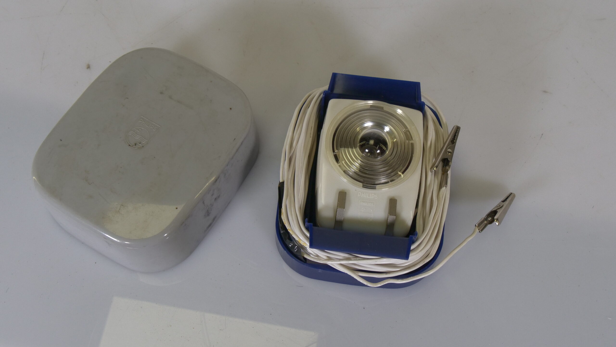 Deze Philips autolamp is een originele vintage 12V werklamp uit de jaren ’60–’70, ontworpen voor gebruik op autoaccu’s. Ideaal als klassiek accessoire voor oldtimers of werkplaatsverlichting onderweg. De lamp is voorzien van krokodillenklemmen, een robuuste lens en een stevige Philips-opbergdoos met reliëflogo. Grondig getest en in volledig werkende staat — een zeldzaam verzamelstuk voor liefhebbers van klassieke Philips-techniek.