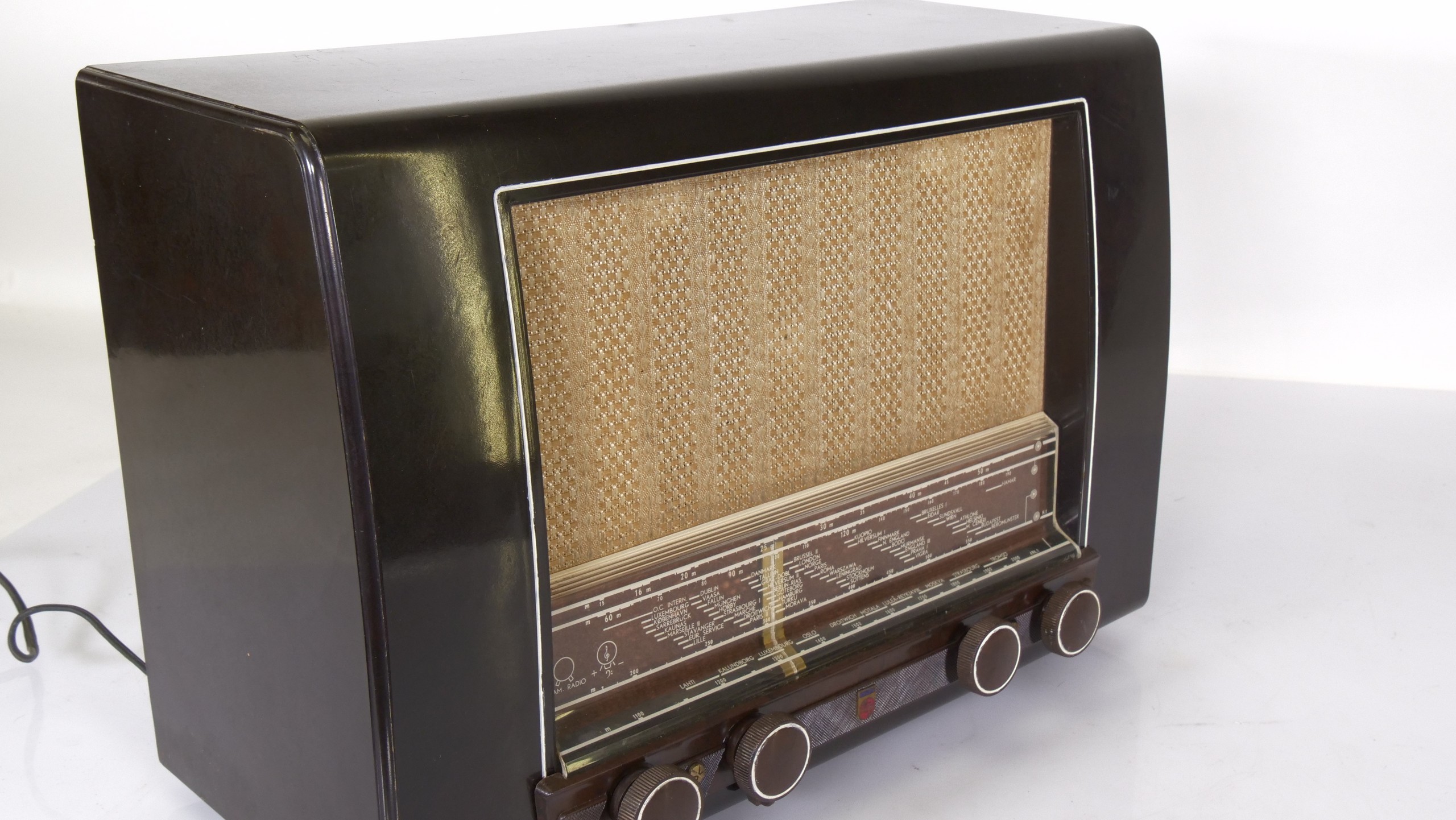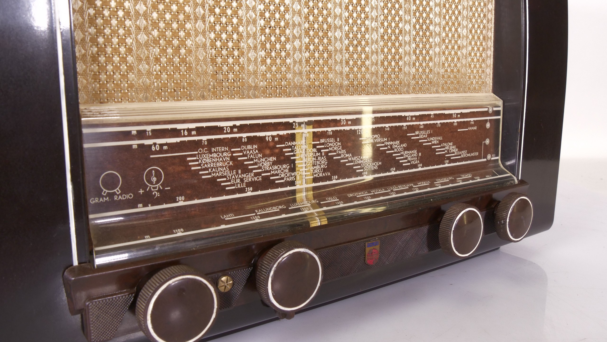Mooie Philips buizenradio uit de jaren ’50/’60 met klassieke Europese stationsschaal. Het toestel schakelt in en geeft geluid (ruis), maar ontvangt momenteel geen radiozenders. Dit is een veelvoorkomend verschijnsel bij oudere buizenradio’s en vaak goed te verhelpen door buizen na te kijken, condensatoren te vervangen of de afstemming te reinigen.
