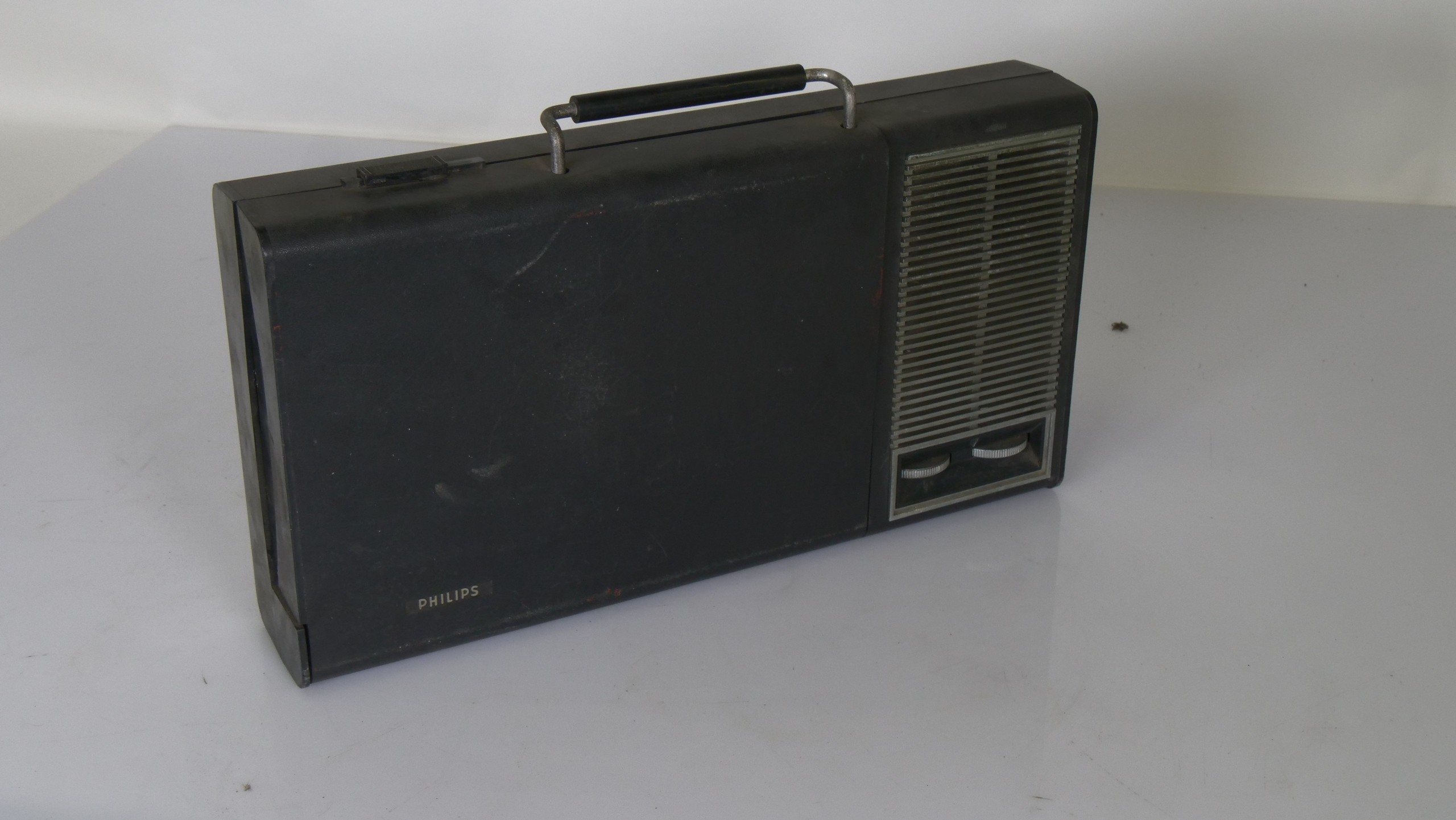 Vintage draagbare platenspeler van Philips uit de jaren 60 in een stevig kofferontwerp met geïntegreerde luidspreker. Dit type platenspeler was bedoeld voor thuisgebruik of onderweg en kon eenvoudig dichtgeklapt worden tot een compacte draagkoffer. De speler heeft een minimalistisch zwart ontwerp met metalen handvat en draaiknoppen voor volume en toon. Binnenin is het draaiplateau en de toonarm geplaatst, samen met decoratieve stickers die een uniek retrokarakter geven.