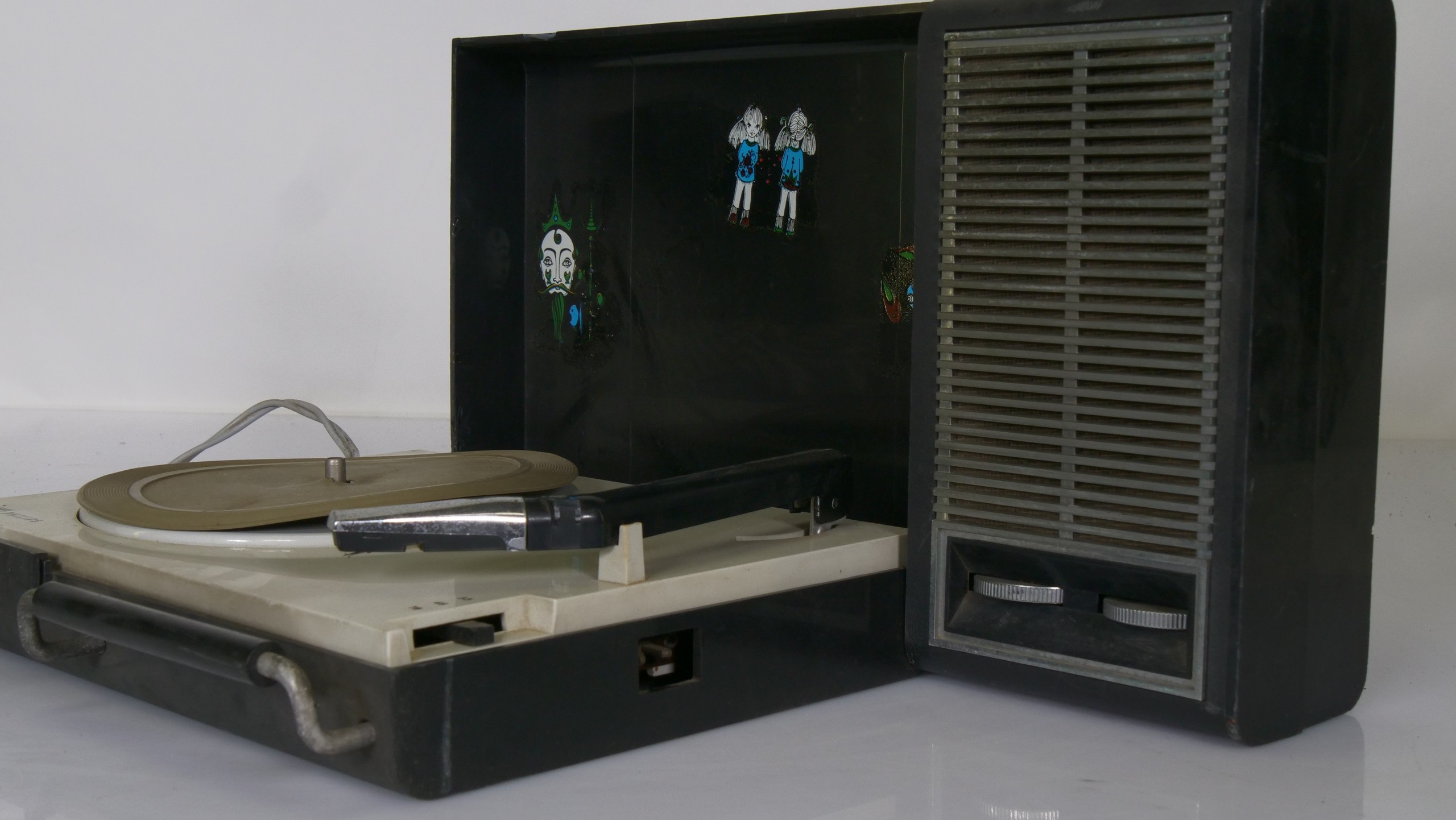 Staat: gebruikt, met gebruikssporen en decoratieve stickers; technisch defect (speelt niet af)
